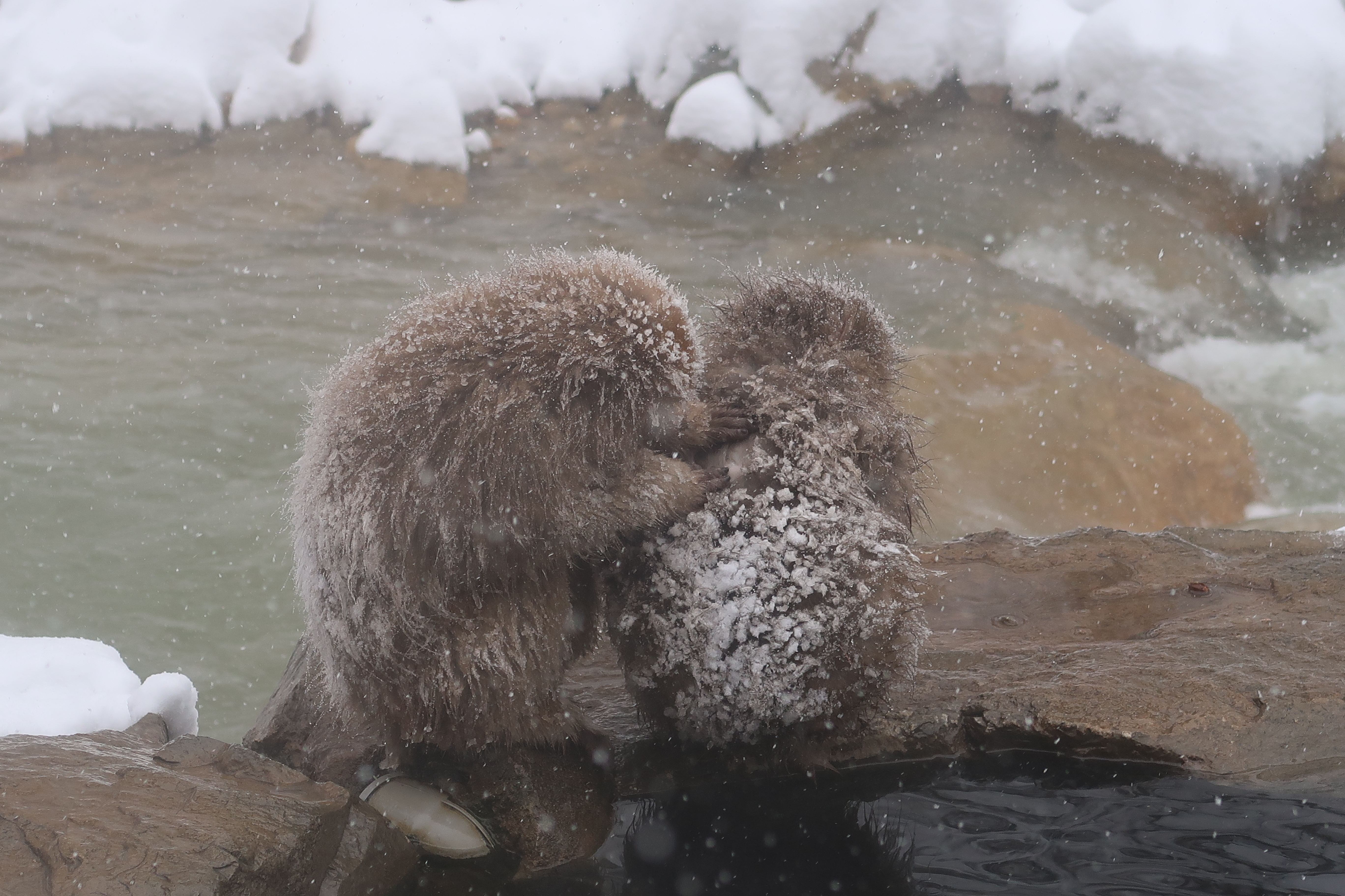 As you’re probably aware, the macaques are famous for their behavior of inhabiting hot springs to maintain their body temperature in the cold months of winter. Like all simian species, they participate in group behavior, such as grooming and play fighting, and have been observed to “roll snowballs.”