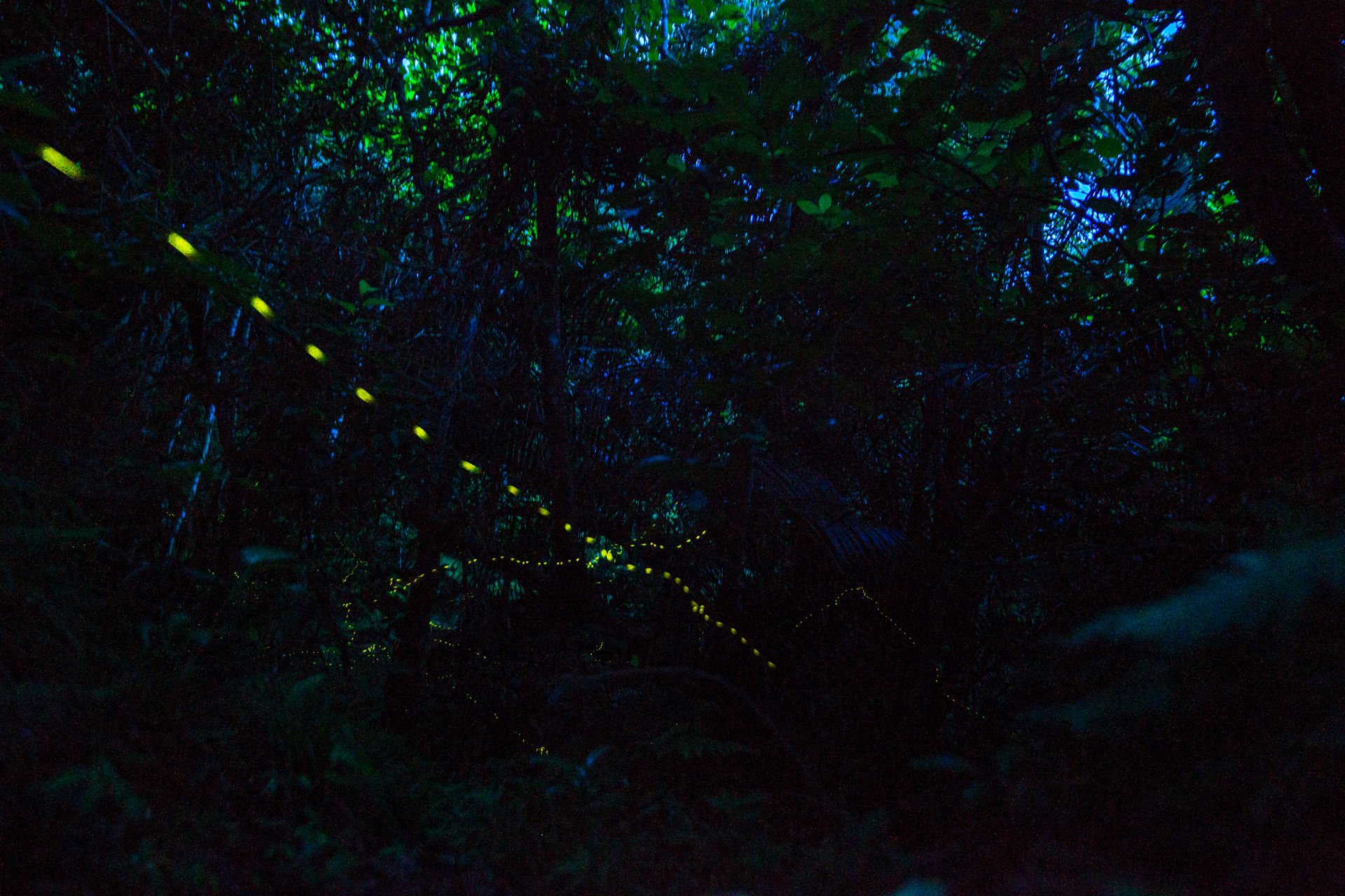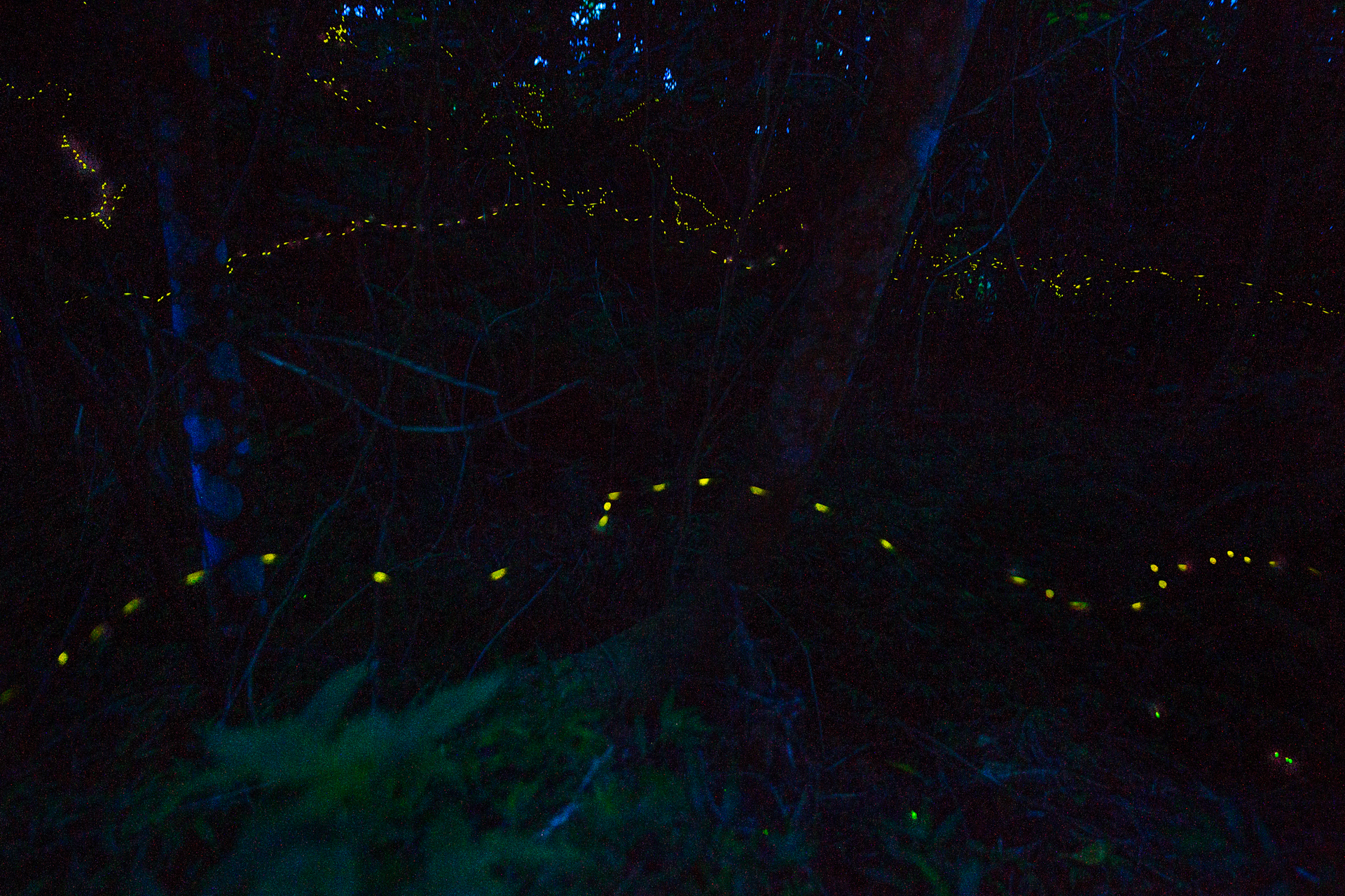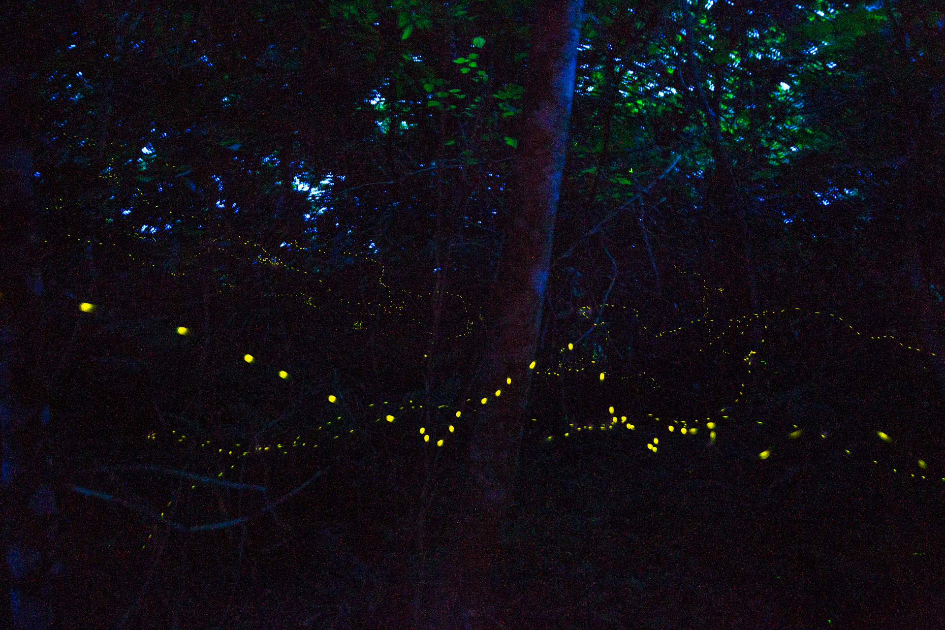 Male fireflies float through the air, flashing their signals to let the females know they are on a quest for romance.