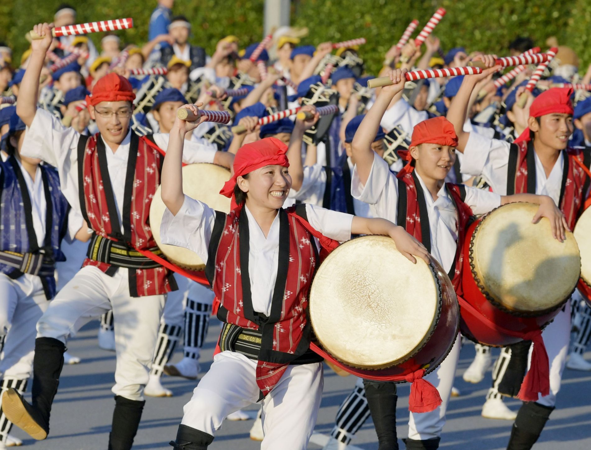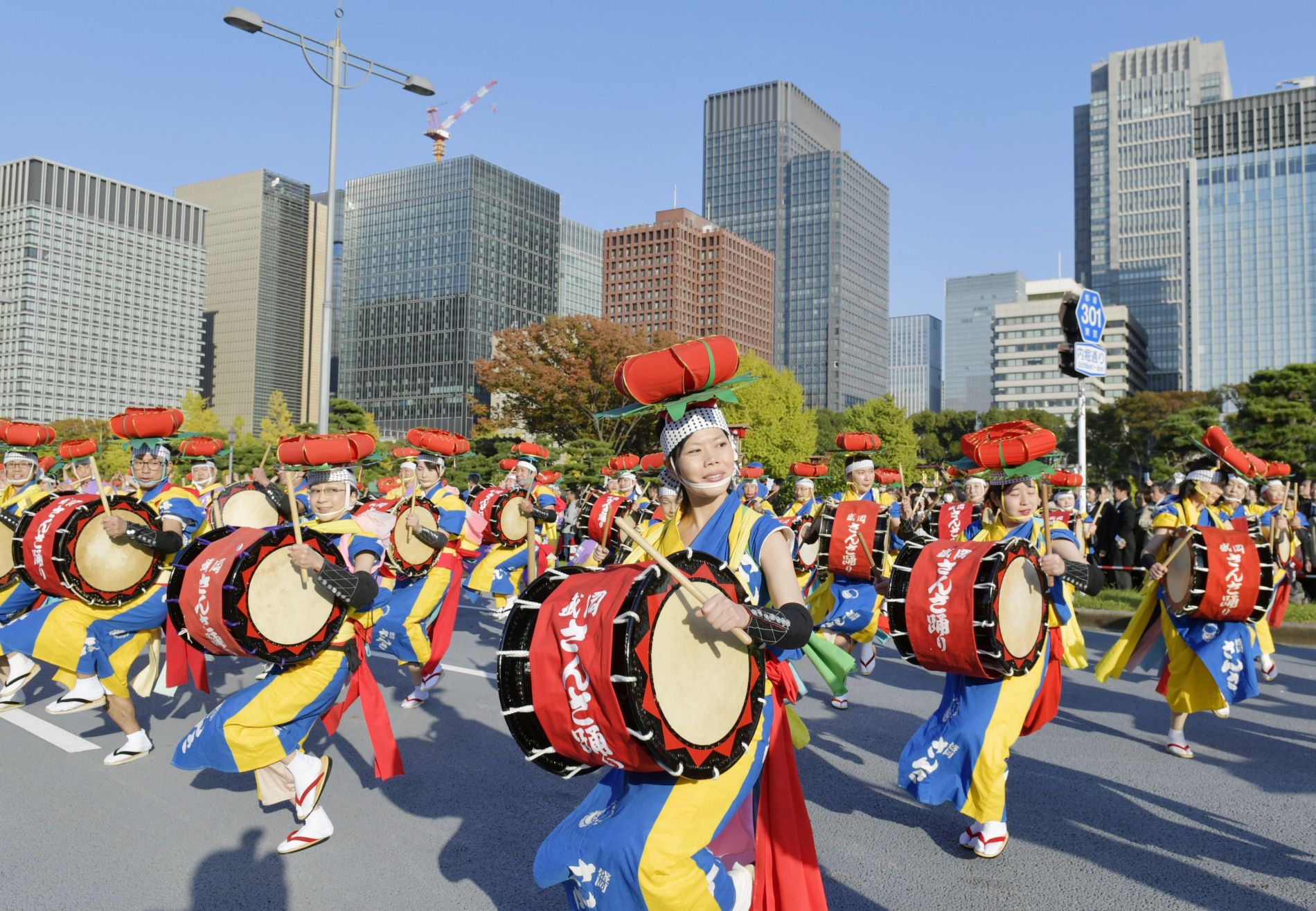 On Saturday, more than 2,000 children and people in folk festival costumes joined a celebratory parade past 5 P.M., showcasing the most famous traditions from all over the country. Japanese from Akita Prefecture, for example, brought the awe-inspiring tradition in which men balancing several-meter-high pole structures with lanterns on their hips as they paraded through the streets of the Chiyoda district in front of the Imperial Palace.