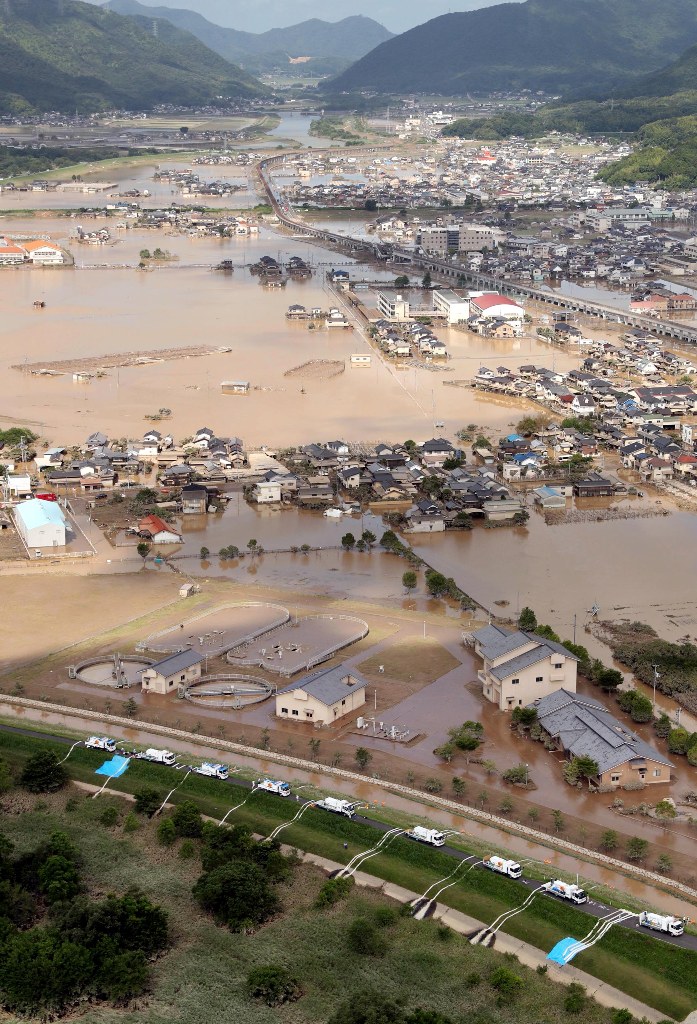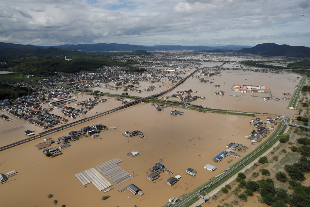 In the Mami-machi area of Kurashiki city, a well-known tourist area in Okayama Prefecture, the river embankment collapsed, causing about 30% of the area to flood. More than 1,000 people were left temporarily on building roofs while waiting to be rescued.