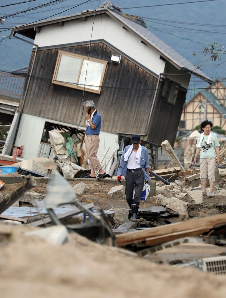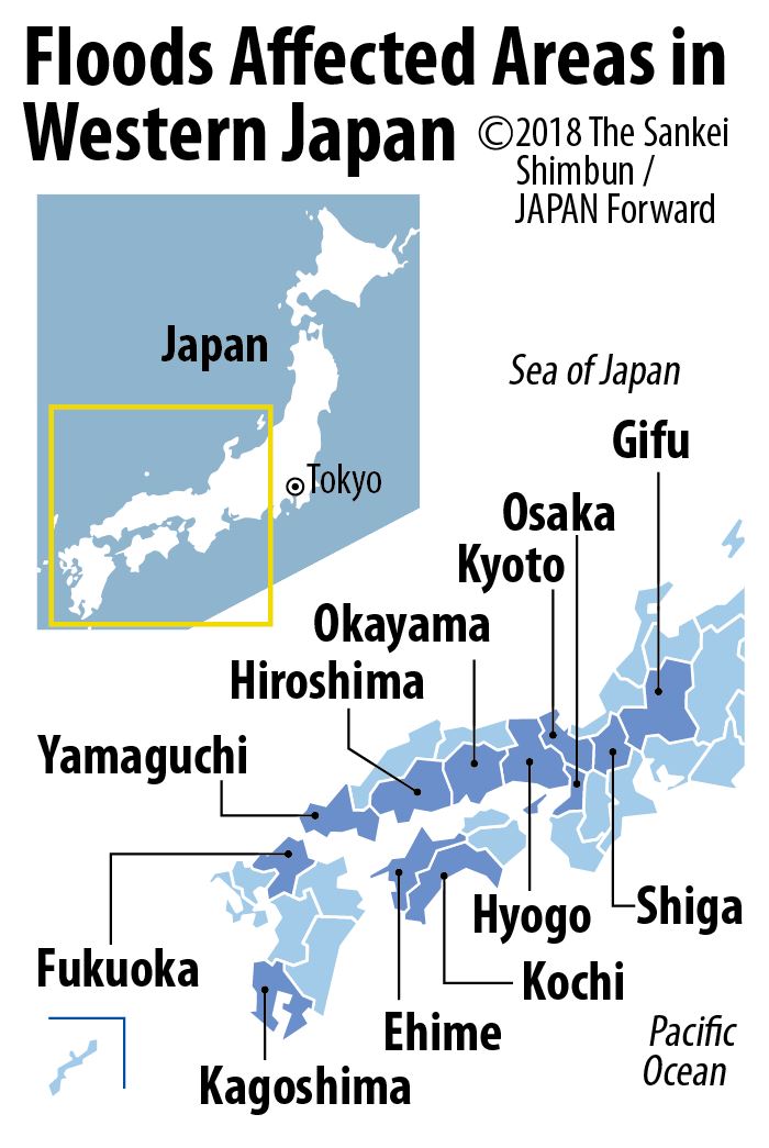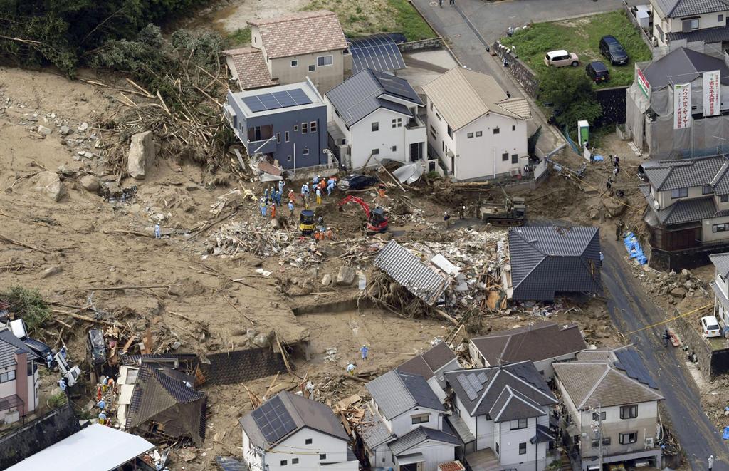 In the town of Uwajima in Ehime Prefecture, a 63-year-old man was buried alive in his house due to landslides. A 58-year-old woman in Otsuki-machi, Kochi Prefecture also died. Three people died at the scene in Ayabe City in Kyoto Prefecture, where two houses collapsed. In Seki, Gifu Prefecture, a man’s car was overturned in a canal. In Kita Kyushu city, a 68-year-old man was killed in a landslide.