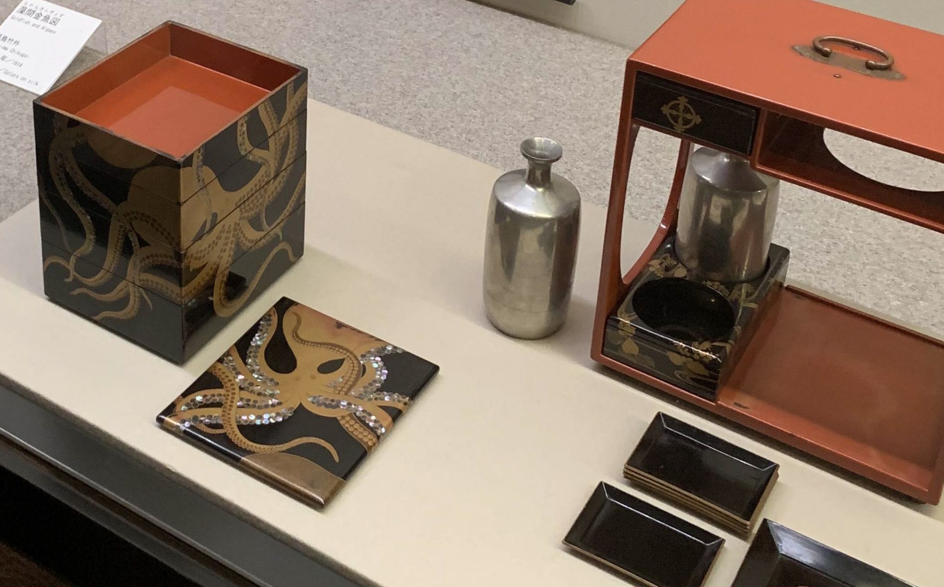 Birds are featured in various forms in hanging scrolls and paintings — from Japanese cranes and mandarin ducks to sparrows, pigeons, nightingales, and peacocks. Other items range from animal motif drawings depicting monkeys, dogs, and tigers, to a large pot featuring swimming carp and kingfishers and a multi-tiered box painted with an octopus wrapped around it.