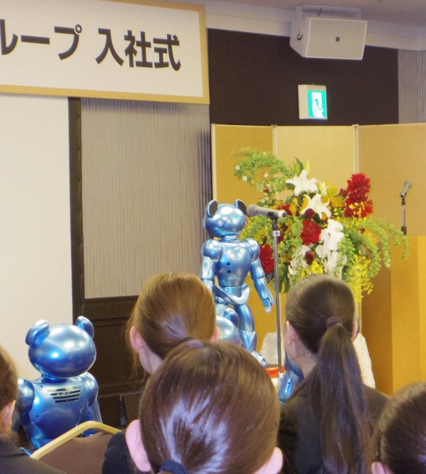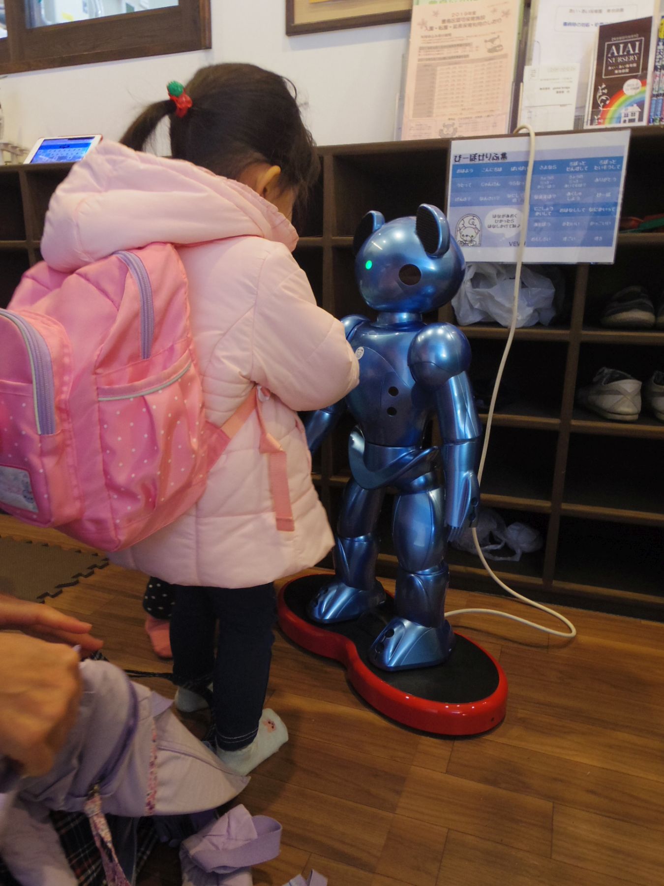 The childcare robot that greeted the 2 sisters is VEVO. The approximately 70 cm tall robot is able to recognize the children's faces, allowing it to change greetings according to the child to whom it speaks. The sisters returned their greetings to VEVO, and entered the facility while nursery school staff waited nearby. Their father, Shingo Mano, 43, a member of Japan's Self Defense Force, explained his first encounter with VEVO, saying he was “surprised to seeing robots have infiltrated the world of children”.