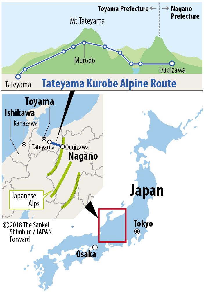 The Tateyama Kurobe Alpine Route runs from Toyama on the southern end to Shinano Omachi on the Nagano Prefecture end of the Tateyama mountain range. The route is 37.2 kilometers long, and much of it is closed over the winter. The entire route is open only until November 30.