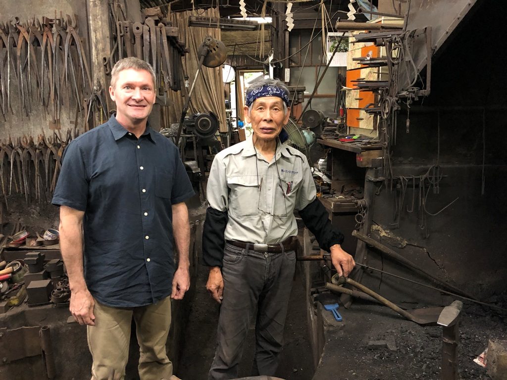 There are only two local connections to sword making remaining in the area. The first is Japanese kitchen knife maker Kuniyoshi Moriya, who has a store in the entrance of the Wako Museum. His father, Munemitsu, was a originally sword maker from Okayama, but gave up making swords after the second world war. He moved to Yasugi and began making kitchen knives because Okayama had been ravaged by the war and is said to have commented that, “Yasugi produces good steel.”