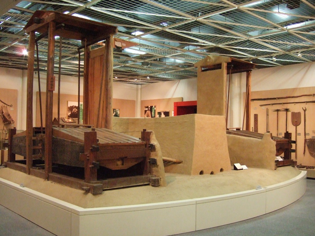 Very close to the Hitachi Metalworks factory is the Wako Museum (Museum of Japanese Metal). Outside the museum is a fine display of kera (iron and steel blooms) that date from the Edo period, through the Meiji to Modern periods. Inside the museum are very concise and thorough displays of the Japanese ancient method of iron and steel making (tatara). There is a fullscale model of a tatara in the middle of the downstairs gallery, surrounded by many smaller models of tatara through the ages, tatara steel production, and actual tools with several videos to help the viewer understand the process.